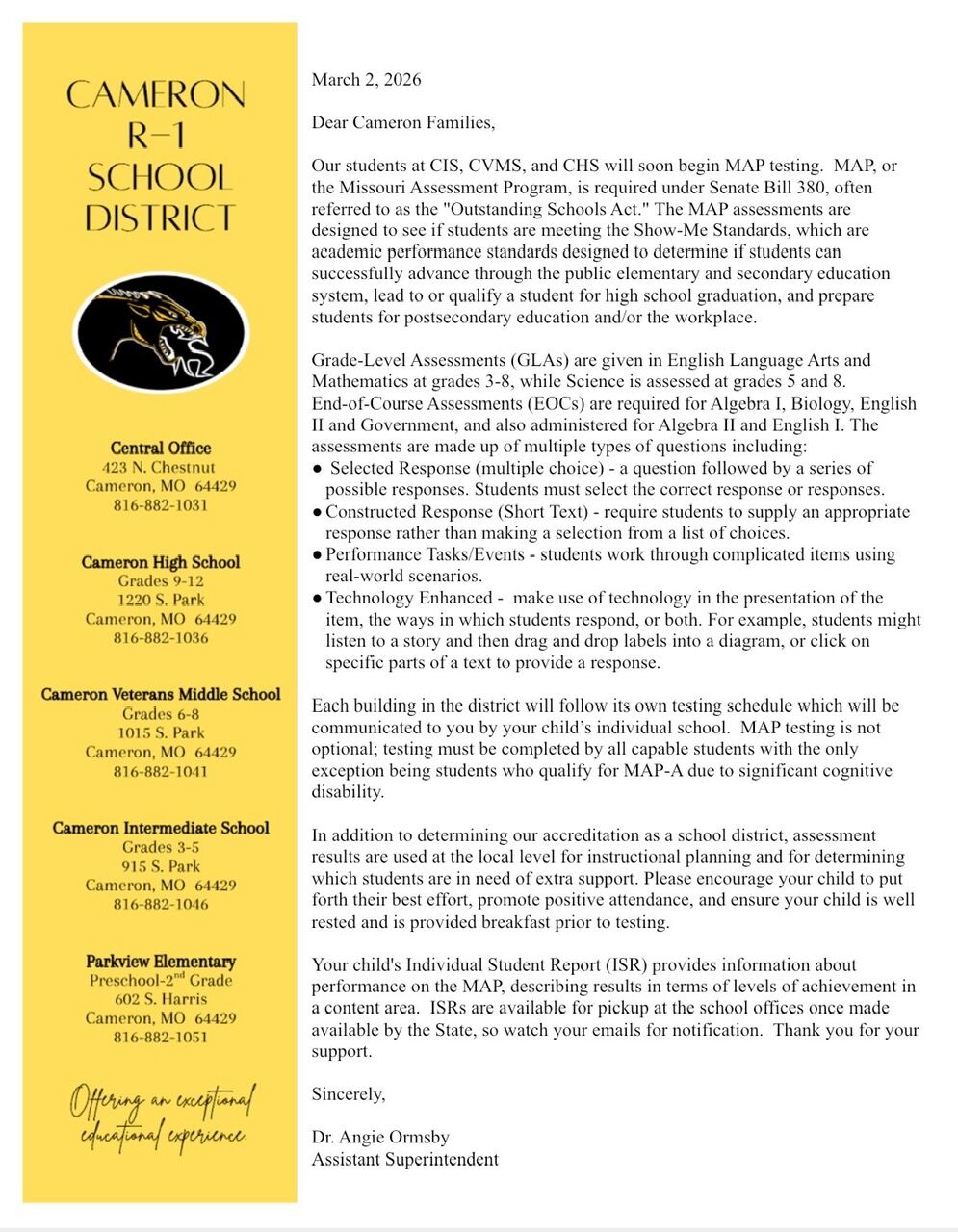 Please read the following letter for important information regarding our Spring 2026 MAP testing. Thank you. MAP Testing Information 2026